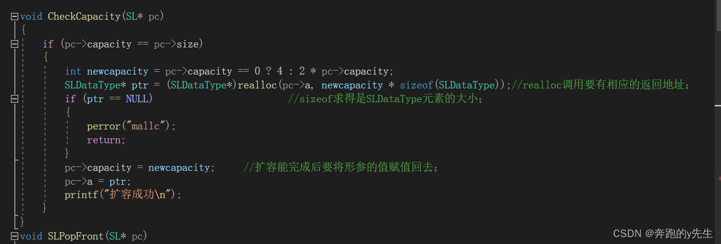 扩容呢,先要确定需要让新容量newcapacity的大小,然后再用realloc函数进行扩容;在进行扩容时要进行对ptr是否为空指针的判断;为空则不进行下面的代码;