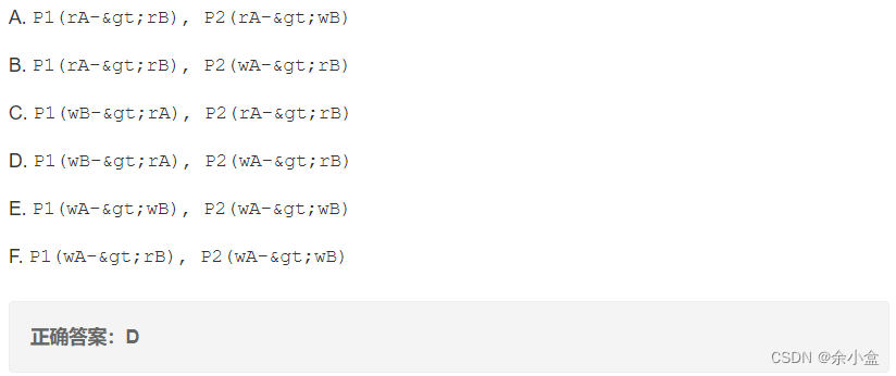6. process P1 and P2, resources A and B, The process operation on resources is defined as follows : Read resources A:rA; Read resources B:rB; Write resources A:wA; Write resources B:wB. At the same time, it stipulates , Before the process reads a resource , A shared lock must be added , An exclusive lock must be added before writing a resource ; When a resource is shared by a process , It can be shared by other processes , But you can't add an exclusive lock ; Resources are locked exclusively by processes , Other processes cannot be locked . Release the lock after the process completes all operations . process P1 And processes P2 Concurrent execution , Which of the following running sequences may deadlock _____.