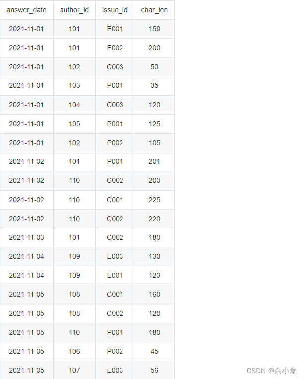 There is a question and answer creator's answer table answer_tb as follows ( among answer_date Indicates the creation date 、author_id Refers to the creator number 、issue_id Express problem id、char_len Indicates the number of words in the answer ):