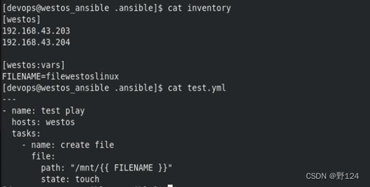 编辑inventory如下,编辑test.yml如下,运行test.yml即可在受控主机中创建filewestoslinux