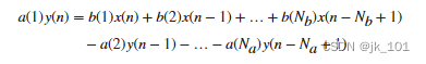 在此方程中,a 和 b 是滤波器系数的向量,Na 是反馈滤波器阶数,Nb 是前馈滤波器阶数。n 是 x 的当前元素的索引。输出 y(n) 是 x 和 y 的当前元素和前面元素的线性组合。