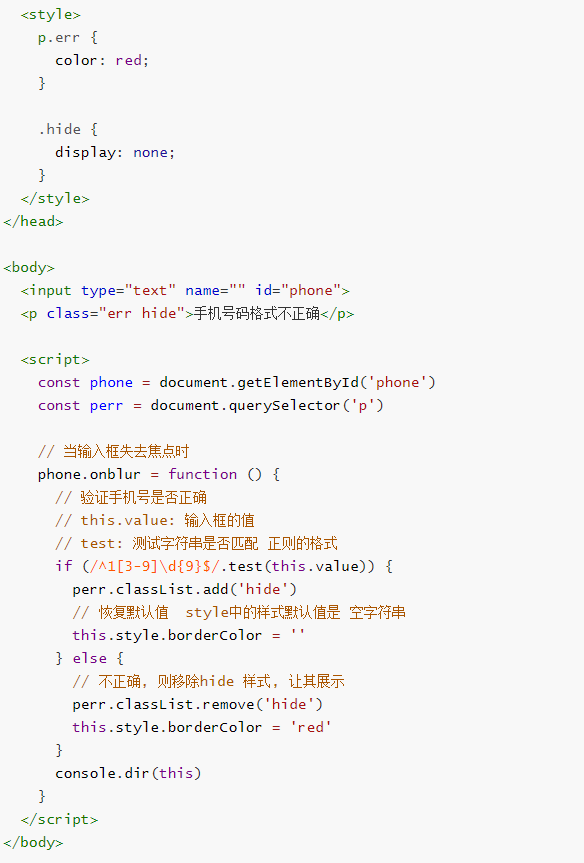 小练习:当输入框失去焦点时,验证手机号是否正确