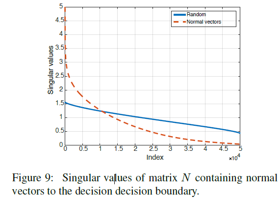 N = [ r ( x 1 ) ∥ r ( x 1 ) ∥ 2 ⋯ r ( x n ) ∥ r ( x n ) ∥ 2 ] N=\left[\frac{r(x_1)}{\|r(x_1)\|_2} \cdots \frac{r(x_n)}{\|r(x_n)\|_2} \right] N=[∥r(x1)∥2r(x1)⋯∥r(xn)∥2r(xn)] For binary classifier , The decision boundary is a hyperplane 、 N N N The rank of is 1, And all normal vectors are collinear . In order to more generally capture the correlation in the decision boundary of complex classifiers , We calculate the matrix N N N The singular value of . adopt CaffeNet Calculated matrix N N N The singular value of is as follows chart 9. The figure shows when N N N Column the singular values obtained when sampling randomly and uniformly from the unit sphere . Although the singular value of the latter decays slowly , but N N N The singular value of decays rapidly , This proves that the decision boundary of the deep network has large correlation and redundancy . More precisely , This indicates that there is a low dimension d ′ ≪ d d'\ll d d′≪d Subspace S S S, It contains most of the normal vectors of the decision boundary in the region around the natural image . Suppose that the existence of universal perturbations that fool most natural images is due to the existence of such a low dimensional subspace , The subspace captures the correlation between different regions of the decision boundary . in fact , This subspace “ collect ” The normals of decision boundaries in different regions are given , Therefore, the disturbance belonging to this subspace may deceive the data points . To test this hypothesis , We choose a norm ξ = 2000 ξ = 2000 ξ=2000 The random vector of , Of the former 100 A subspace traversed by a singular vector S S S, And calculate the fooling rate of different image sets ( That is, a group that has not been used to calculate SVD Image ). This disturbance can deceive the near 38% Image , So it shows that in this subspace S S S The random direction in is obviously better than the random disturbance ( This disturbance can only deceive 10% The data of ).