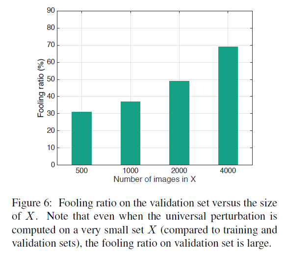 The second experiment Used to verify X X X The influence of the size of the on the universal disturbance . chart 6 It shows GoogleNet In different X X X The fooling rate . Experiments show that only in X = 500 X=500 X=500 when , The fooling rate can reach 30%.