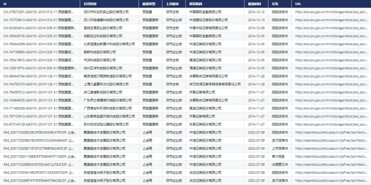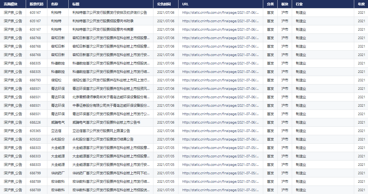 The data collected in this paper are those listed on Shanghai Stock Exchange and Shenzhen Stock Exchange A Stock company IPO Filing and issuance documents , Include **IPO Pre disclosure documents 、IPO Inquiry letter document 、IPO Release documents ( Contains two different sources )** Three modules , And each pair of Shenzhen 、 The Shanghai Stock Exchange will display in different areas .