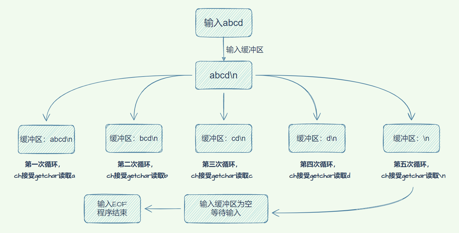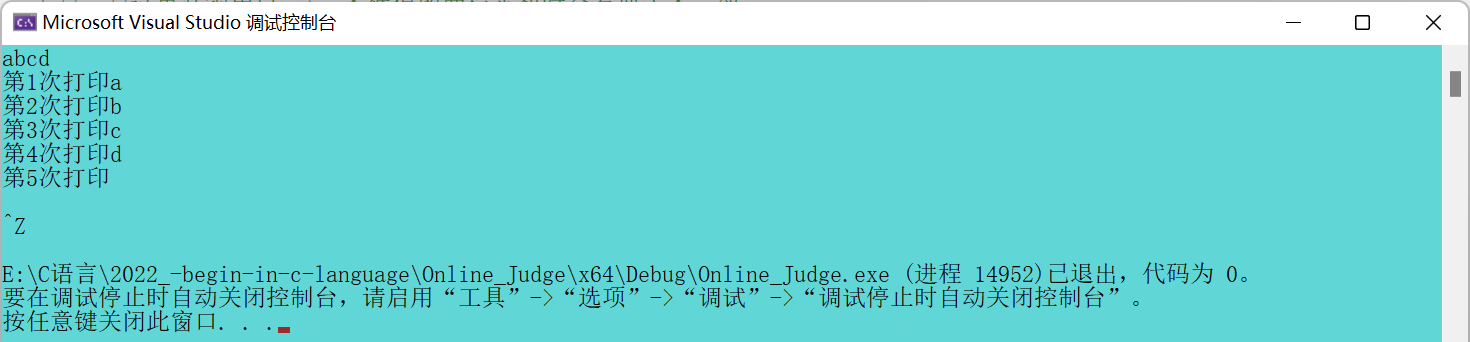 详解:从输出结果可以看出,我们从头到尾只输入了一次:abcd 当我们回车,键入数据后,每循环一次屏幕上打印一行数据,当打印完a、b、c、d四行数据后,由于输入缓冲区中还剩一回车(\n)所以第五次循环打印回车(\n),此时因为未遇到结束符EOF所以屏幕光标继续闪烁等待输入,此时在VS编译器下键入Ctrl+z使循环停止。如图: