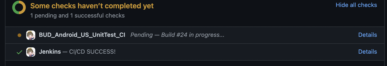 4、 Here we are , Configuration is complete . Next, send a to a branch of the project pull request test . Hair PR after GitHub Displayed on the pending check state