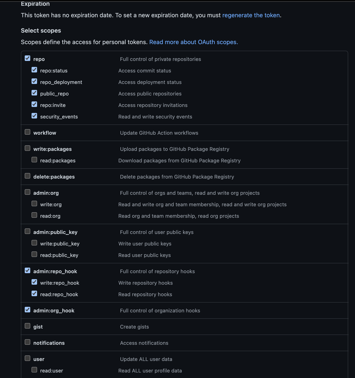 GitHub Click on your avatar , Choose in turn Settings > Developer settings > Personal access tokens, Click on Generate new token Button to enter new Token Generate page , Check the options shown in the figure , spot Generate token Button generation Token And will generate Token Copy and save .