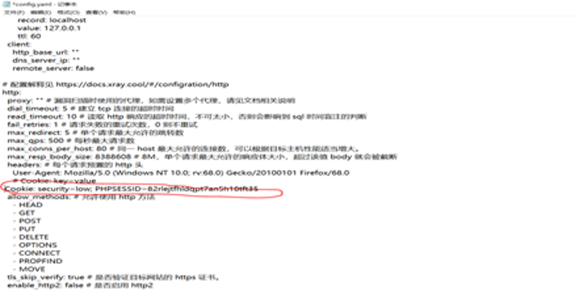 首先我们打开DVWA靶场,挂上代理>>抓包>>将DVWA登陆页面的数据包中的cookie复制到我们的Xray扫描工具的配置文件中;