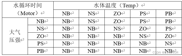 由于多输出的模糊控制算法过于复杂, 因此可利用模糊控制器的解耦特性, 将模糊控制系统分解为多个单输出的子系统,系统模糊控制如表1所示。例如可根据温度和气压控制水泵的打开时间, 本文将以此为例设计模糊控制器。