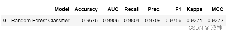 The above is the default 10 fold (fold) Evaluation results after cross validation , This evaluation result is consistent with compare_models() The first of the results is completely consistent . And compare_models() similar , If you want to fold Parameters from the default value 10 Change to a different value , You can use fold Parameters . for example :create_model('rf', fold = 5) Will use 5 Delamination CV Create a decision tree classifier .