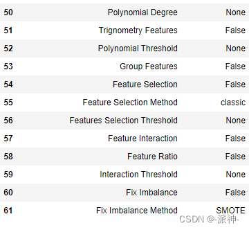 Note that some data preprocessing steps must be performed, such as missing value completion 、 Classification code (one-hot), Delete linear related columns, etc ,setup() It has been automatically completed for you , It doesn't need any human operation , This saves everyone's development time . Here's another thing setup() The parameters in are optional , In this case, at setup() In addition to two necessary parameters , We have adopted the default parameters for other parameters , For a detailed description of parameters, see pycaret Official documents .