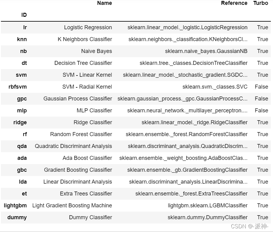After execution compare_models() After that, we generally know that the performance of those models is excellent , And then we can use it create_model() Method to create the specified algorithm model , When creating the specified algorithm model, anyone will perform cross validation to evaluate the performance of the specified model . Here we can also use models() Methods to list pycaret All built-in classifiers :