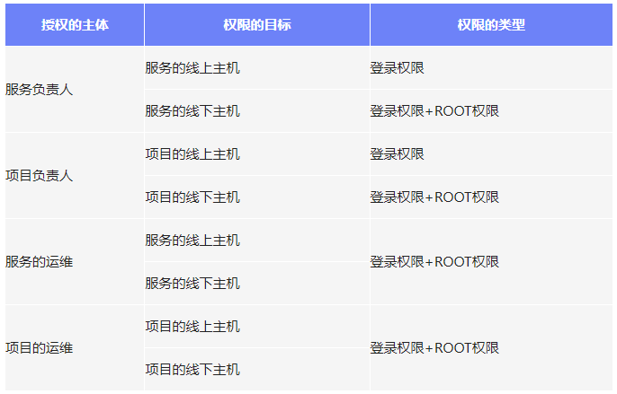 Because of the same project / Services are often maintained by people in the same group , therefore jmp-api Built in default permission policy , Allowed items / The person in charge of the service is responsible for the project / The service directly has login permission , Without having to apply ; Only corresponding items are supported / The operation and maintenance principal of the service owns by default root jurisdiction , If everyone else wants to get root jurisdiction , Must be applied for , It shall be approved by the operation and maintenance principal of the corresponding service .