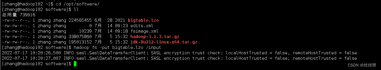[[email protected] software]$ hadoop jar /opt/module/hadoop-3.1.3/share/hadoop/common/hadoop-lzo-0.4.20.jar com.hadoop.compression.lzo.DistributedLzoIndexer /input/bigtable.lzo
