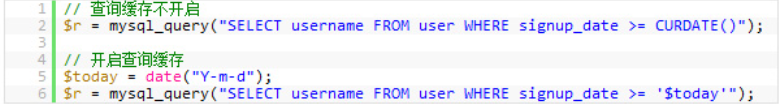 The top two SQL The difference between sentences is CURDATE() ,MySQL The query cache of does not work for this function . therefore , image NOW() and RAND() Or something like that SQL Functions do not turn on query caching , Because the return of these functions is variable . therefore , All you need is a variable to replace MySQL Function of , To turn on caching .