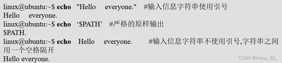 echo命令用于在标准输出——显示器上显示一段文字,一般起到提示作用。echo命令的一般语法格式为:
