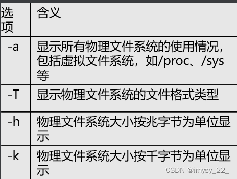 其中,参数Filesystem表示物理文件系统。各选项的含义如表所示。