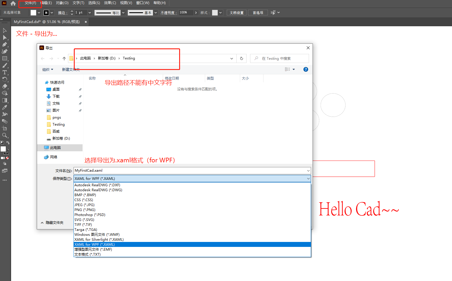 5、 ... and 、AI After the tool is opened , choice file - Export to .xaml Format . Under normal circumstances, it can be exported as silverlight and wpf Two kinds of , Here we choose to export as wpf Supported by xaml Format .