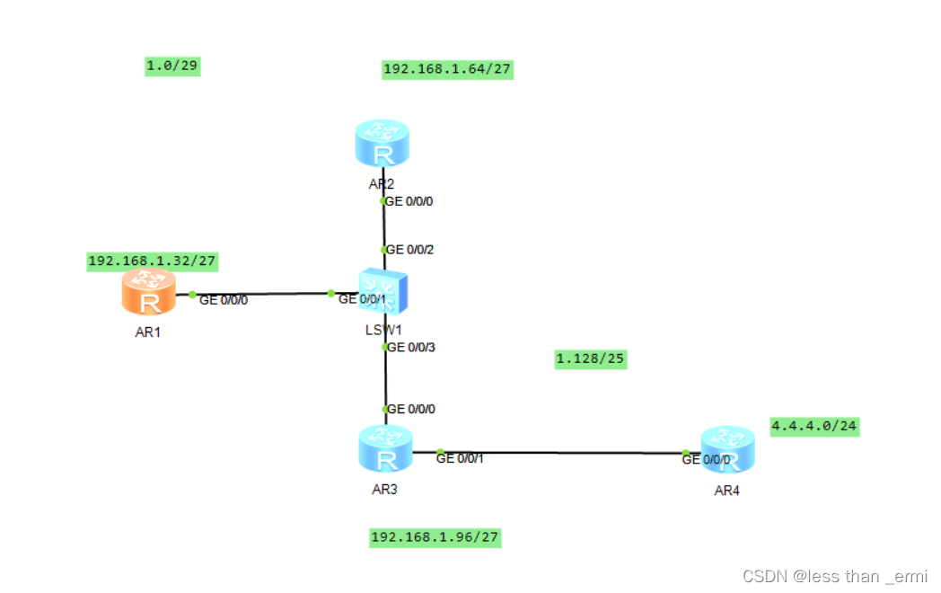 R1-R3 Is the region 0,R3 To R4 Is the region 1, So you can 192.168.1.0/24 Divided into two network segments 192.168.1.0/25 For area 0 192.168.1.128/25 For area 1 ; then 192.168.1.0/25 Divided into four network segments 192.168.1.0/27( be used for MA Network segment ) 192.168.1.0/29 192.168.1.8/29 192.168.1.16/29 192.168.1.24/29