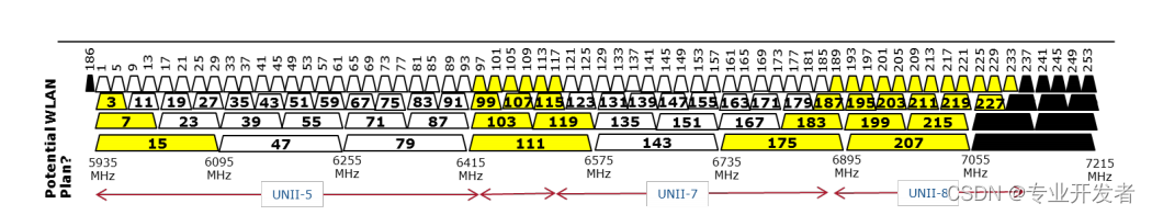 ■基本问题是信道编号与现有2.4 GHz和5 GHz频段的信道编号重叠。 例如,信道号1.2、3…与2.4 GHz频带重叠,信道号36、40、44等与5 GHz频带重叠。