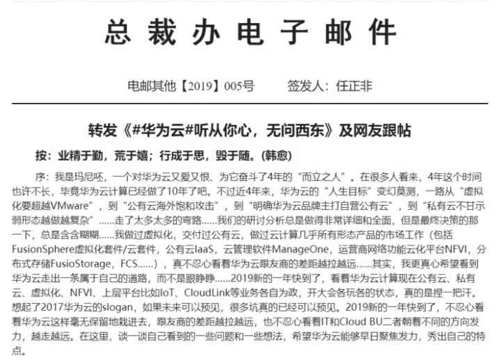 Later, there were a lot of posts from Huawei people , The most important thing is to get Ren Zhengfei's email forwarding . before , Ren Zhengfei has also repeatedly stressed in internal e-mails or speeches that Hua Wei Yun want “ Call for fire ”.