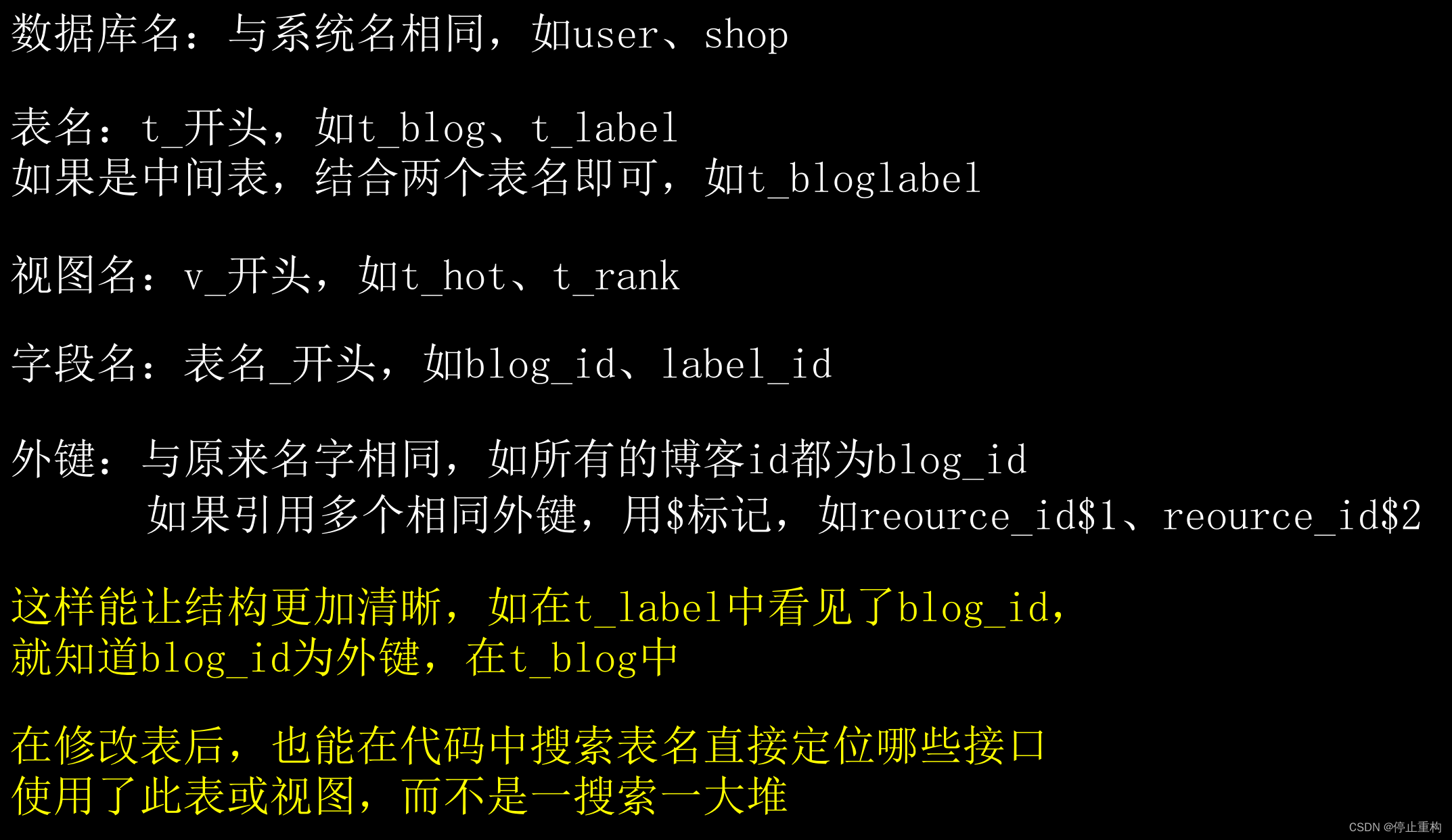 Our recommended database naming conventions are as follows , The name of the database is the same as the system name , Table name t_ start , View to v_ start Fields in the table , If it is unique in the table , Use table name _ start , If it's a foreign key , Use its original name , The view does not change the name of the field . such , Even without E-R chart , You can also judge the relationship between tables by field names . Although it seems simple , But it can prevent many unnecessary bug.