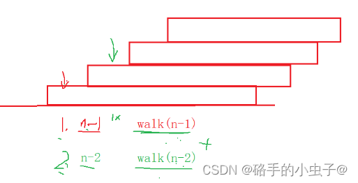 通过分析可以发现青蛙跳台阶问题可以类似于一个斐波那契数:当青蛙要跳到第一个台阶时可以跳一个台阶;当青蛙要跳到第二个台阶时可以跳一个2级台阶或者两个1级台阶;当台阶数大于2即N个台阶时,可以从第N-1个台阶跳、也可以从第N-2个台阶跳——walk(n)=walk(n-1)+walk(n-2)。