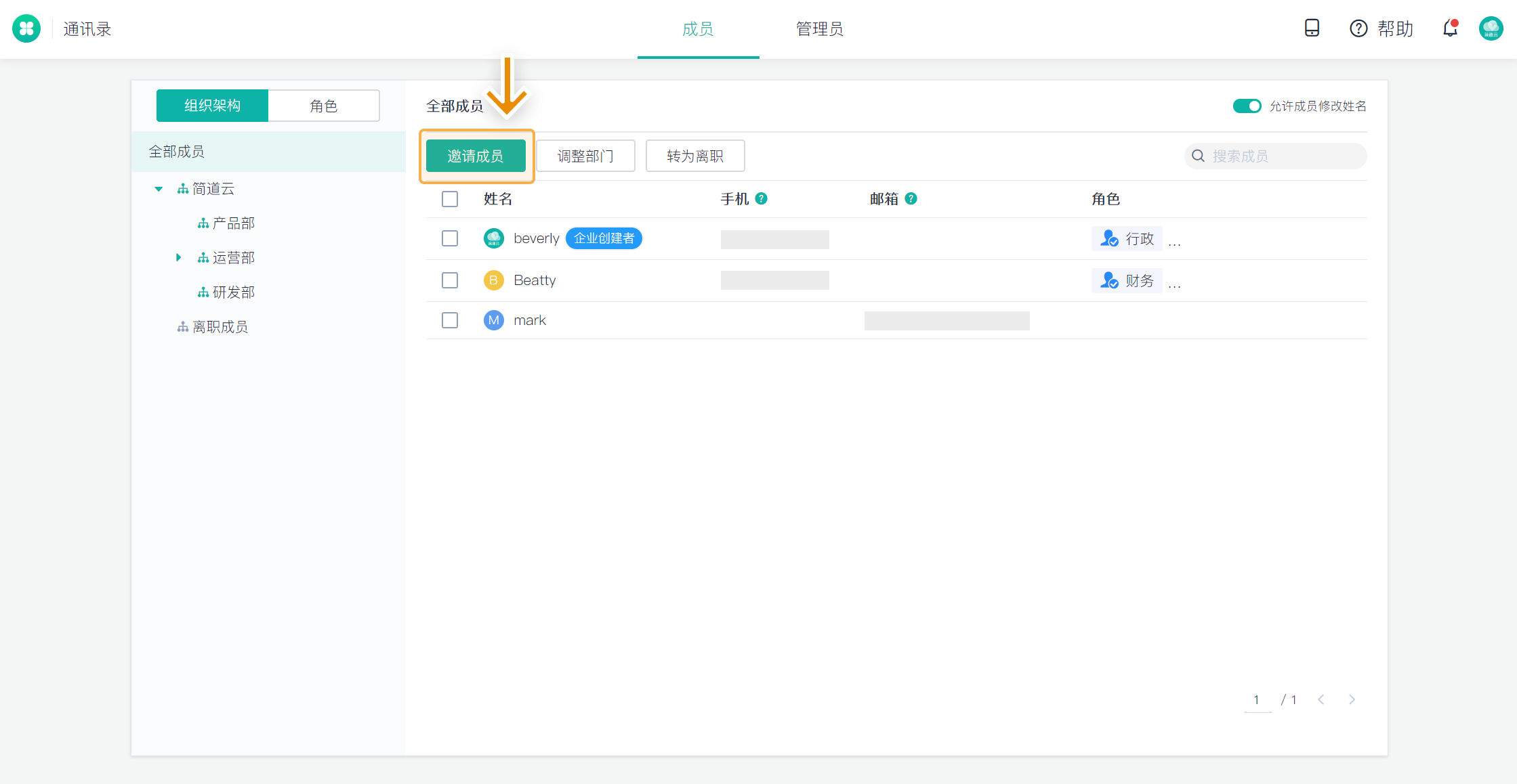 首先 点击注册 一个简道云账号,注册完成后,点击工作台 >> 通讯录,邀请成员加入到团队中来。