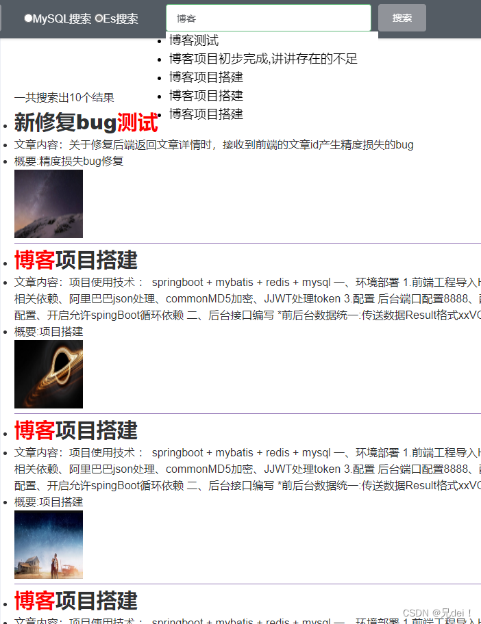 The following is a es, There are search recommendations ( Judge by prefix ), There are multiple fields ( Article title , Summary , Content ) And fuzzy query ( Intelligent error correction, etc )