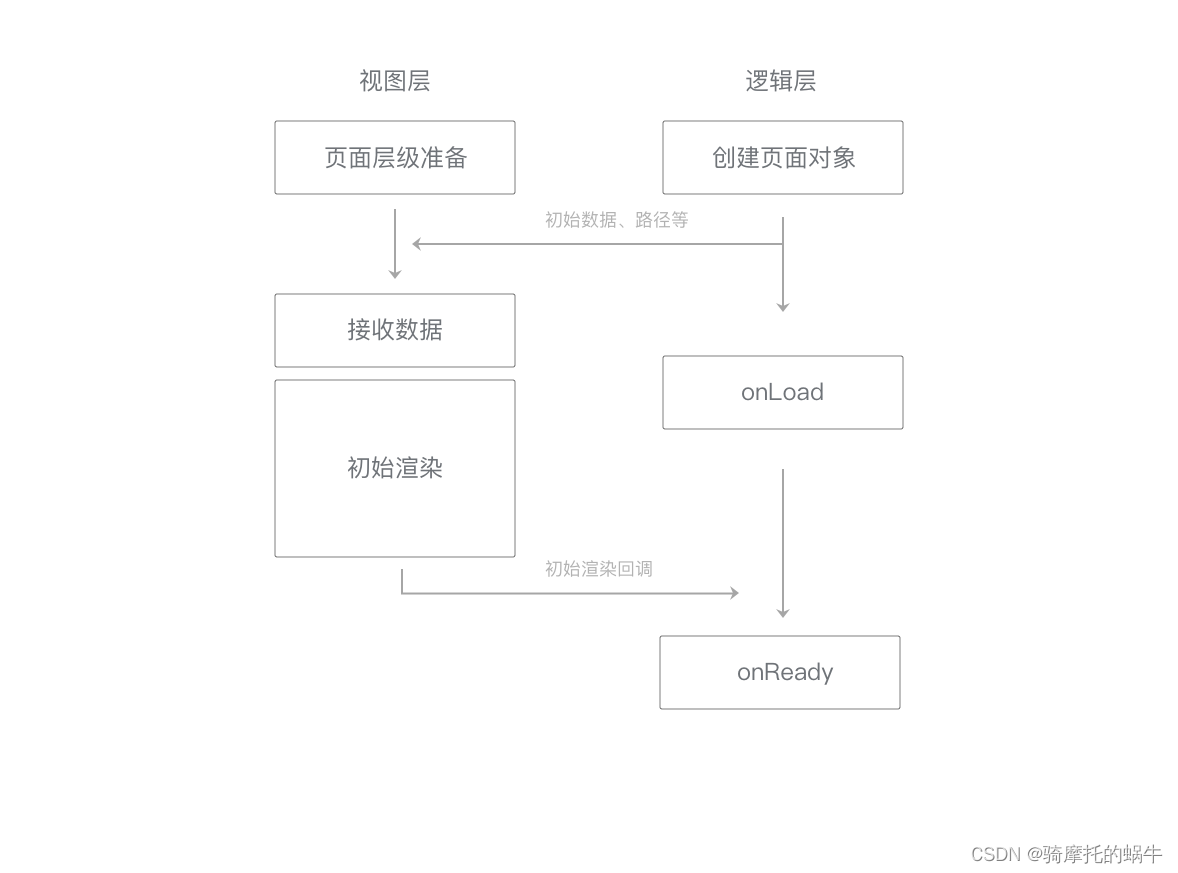 When the applet starts or a new page is opened , Initial data of the page (data) And path information will be sent from the logical layer to the view layer , For initial rendering of view layers .Native The layer passes this data directly to the view layer , At the same time, show users a new page level , The view layer draws the interface at this page level . After the view layer receives the relevant data , Select the appropriate page path WXML structure ,WXML Structure combined with initial data , Get the first rendering result of the page .