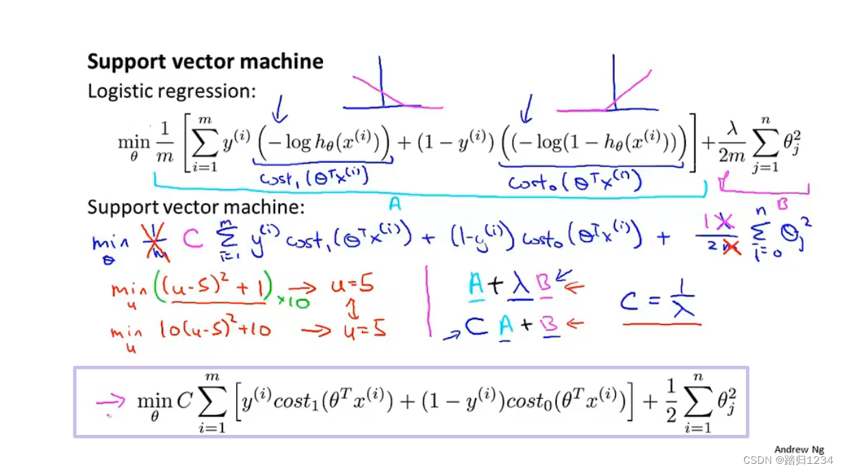 在逻辑回归代价函数的基础上,将 − l o g ( h θ ( x i ) ) -log(h_\theta (x^{i)}) −log(hθ(xi))用 c o s t 1 ( θ ( x i ) ) cost_1(\theta (x^{i)}) cost1(θ(xi))代替;将 − l o g ( 1 − h θ ( x i ) ) ) -log(1-h_\theta (x^{i)})) −log(1−hθ(xi)))用 c o s t 0 ( θ ( x i ) ) cost_0(\theta (x^{i)}) cost0(θ(xi))代替;将 1 m \frac 1m m1去掉(无论 1 m \frac 1m m1是否去掉,对最终的 θ \theta θ值没影响)。之后,将 λ \lambda λ去掉,改为在A项(如图)前加入常数 C C C。最终得到支持向量机的代价函数