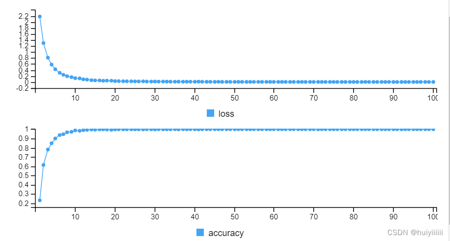每次神经网络的升级是使用了100个样本,这100个样本来自于对1000个样本的抽样。每个epoch包含了10次iteration,一共100个epoch。