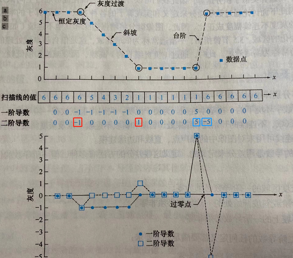 Edges are usually similar to ramp transitions in grayscale , At this time, the first derivative will produce a wide edge , Because the derivative of the slope is non-zero . On the other hand , The second derivative will produce a width of 1 Pixels and by 0 Separated double edges . From this we come to the conclusion that , Compared with the first derivative , The second derivative can enhance finer details , Therefore, it is an ideal feature of sharpening images . in addition , Compared with realizing the first derivative , Less computation is needed to realize the second derivative .
