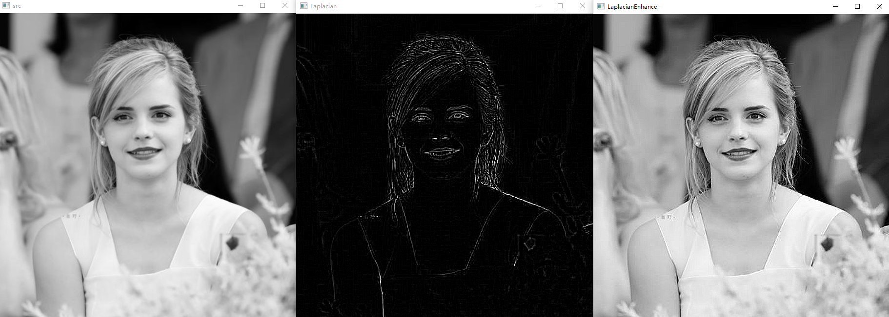 void LaplacianEnhance(Mat& srcImage, Mat& dstImage) { for (size_t i = 1; i < srcImage.rows - 1; i++) { for (size_t j = 1; j < srcImage.cols - 1; j++){ dstImage.at<uchar>(i, j) = saturate_cast<uchar>(5 * srcImage.at<uchar>(i, j) - srcImage.at<uchar>(i - 1, j) - srcImage.at<uchar>(i, j - 1) - srcImage.at<uchar>(i + 1, j) - srcImage.at<uchar>(i, j + 1)); } } }