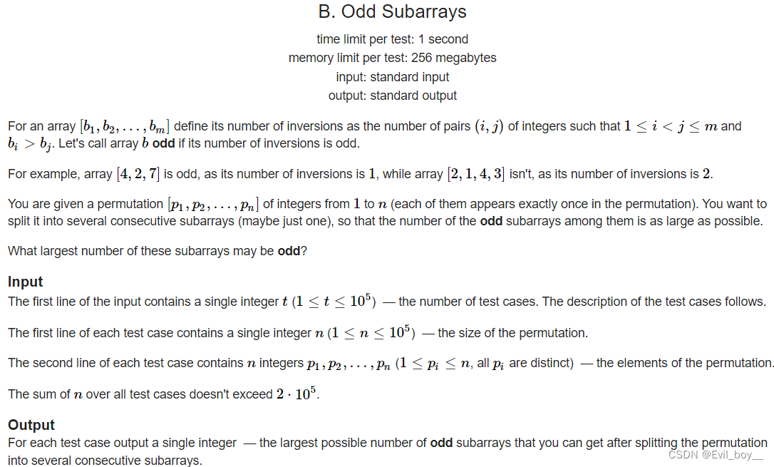 An array b, If i<j also ai>aj, So this pair (i,j) Even a reversal number , If the number of inverses of this array is odd , Then say that this array is odd . Ask how many consecutive odd subarrays you can split an array into