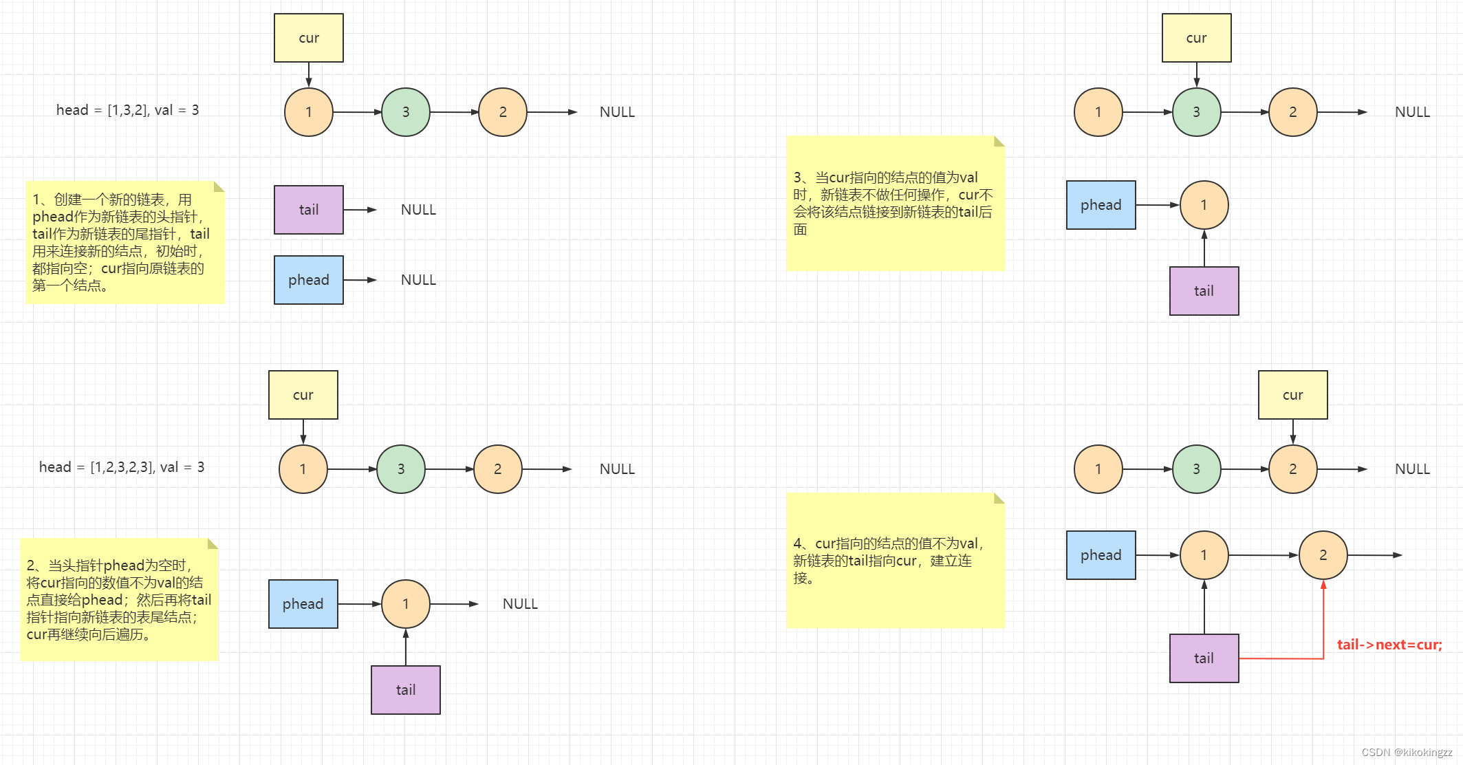 我们想到使用三个指针,用一个指针phead来建立一个新链表,指向新链表表头;再用一个指针tail指向新链表中最后一个结点;最后一个指针cur用来遍历原链表,cur挨个向后遍历,遇到数值不是val的结点,就将新链表的尾结点指向这个结点。