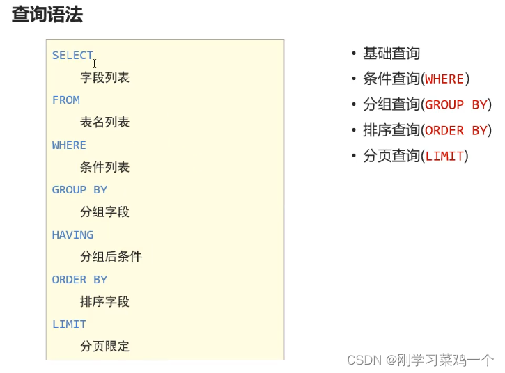 SELECT 字段列表 FROM 表名 [WHERE 分组前条件限定] GROUP BY 分组字段名 [HAVING 分组后条件过滤];