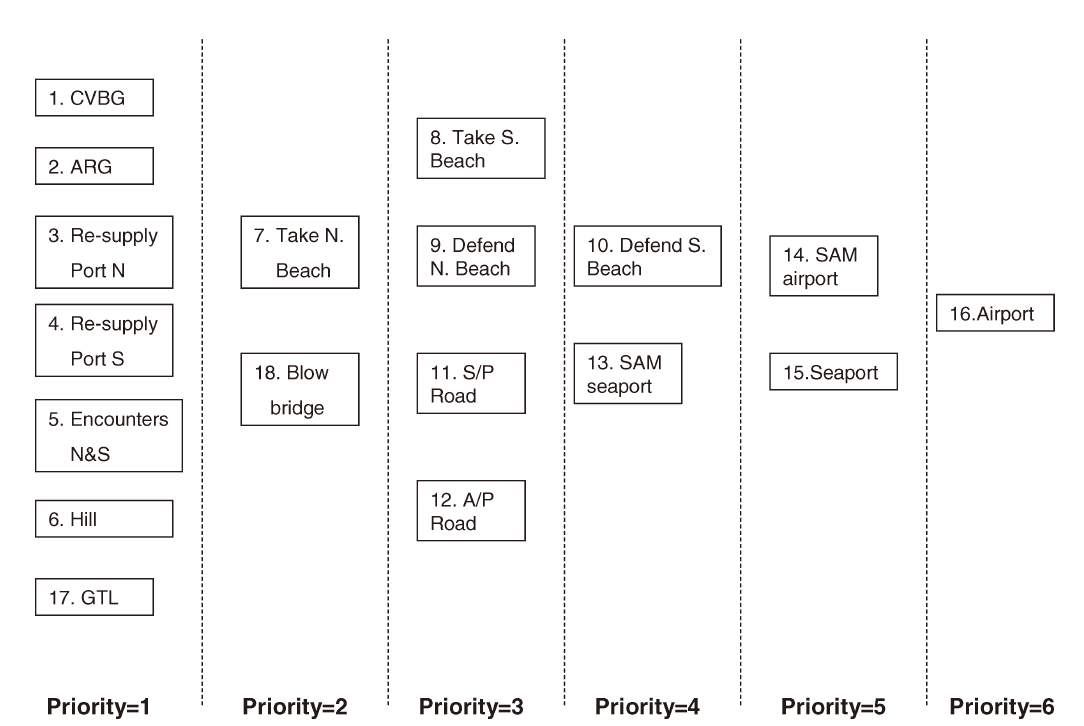 1)操作级别控制 (Operational-level control,OLC) 架构用于任务分解、缜密计划、指挥,以及决策者内部协调。这个阶段着重于全局任务目标,即从指挥官的角度出发,建立一个初始的部队结构,在任务开始前将下属单位安排在正确的地点和时间。随着任务的进行,OLC将实时监控任务进度并根据需要调整初始计划,以确保任务成功完成;
