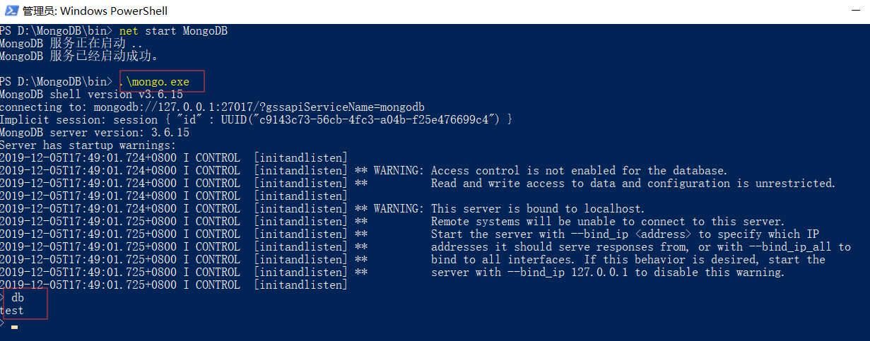 D:\MongoDB\bin\mongo.exe I am here powerShell The effect of execution in is as follows , Connect to MongoDB Then we can enter db By default, the command view points to test database .