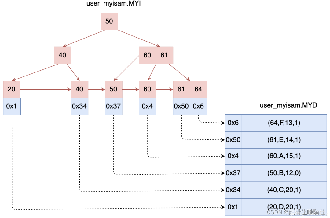 If you want to query id = 40 The data of : First, according to MyISAM Index file ( As shown in the figure above, left ) Look for id = 40 The node of , Through the data area of this node, get the disk address where the data is really saved , From... Through this address MYD Data files ( As shown on the right above ) Load the corresponding record in .