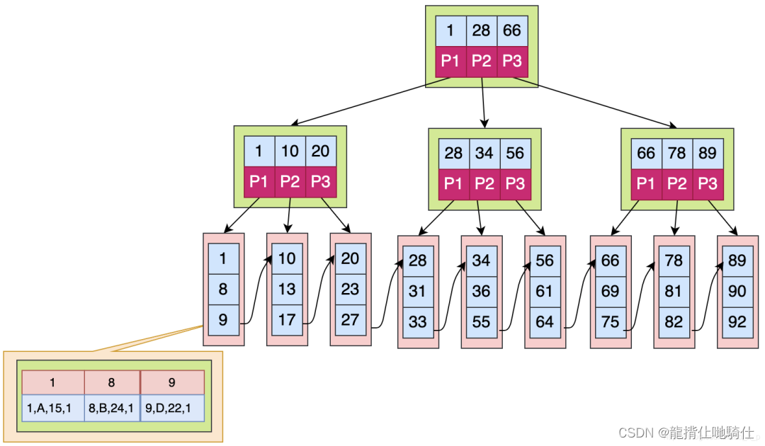 B+Tree Leaf nodes are arranged in order , And the adjacent nodes have the relationship of sequential reference , As shown in the figure above, leaf nodes are connected by pointers .
