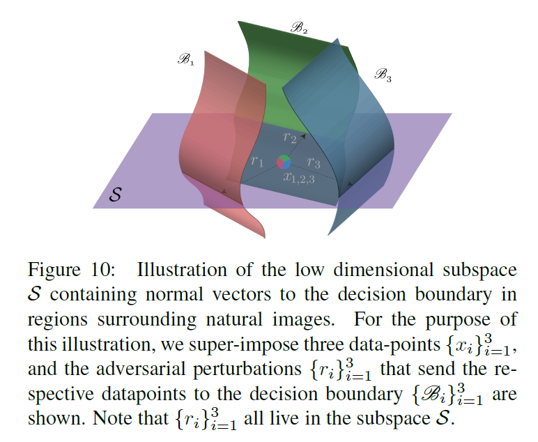 图10展示了捕获决策边界中的相关性子空间 S S S。应该注意的是,这种低维子空间的存在解释了图6中获得的普适扰动令人惊讶的泛化特性,其中人们可以用很少的图像构建相对泛化的普适扰动。