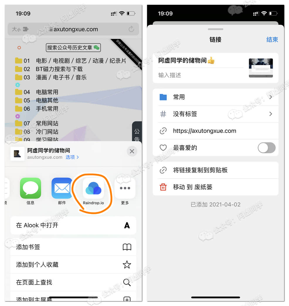 移动端通过浏览器的分享功能,也很轻松能添加收藏到 Raindrop