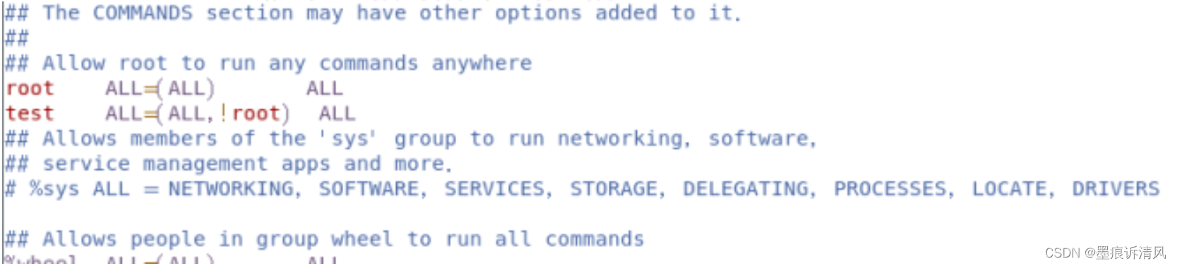 command :test ALL=(ALL,!root) ALL