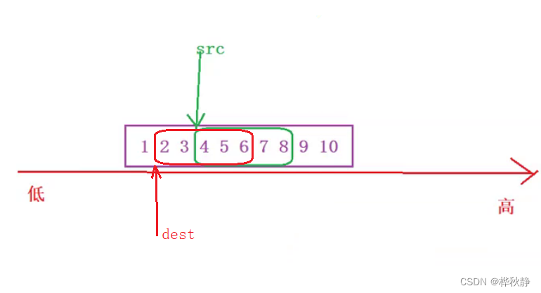 基于上述分析,为了利于实现,这里就认为:只要dest小于src就从前向后拷贝,大于就从后向前拷贝。