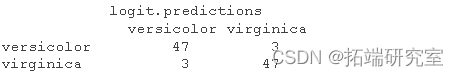 logit.predictions <- ifelse(predict(logit.fit) > 0,'virginica', 'versicolor')