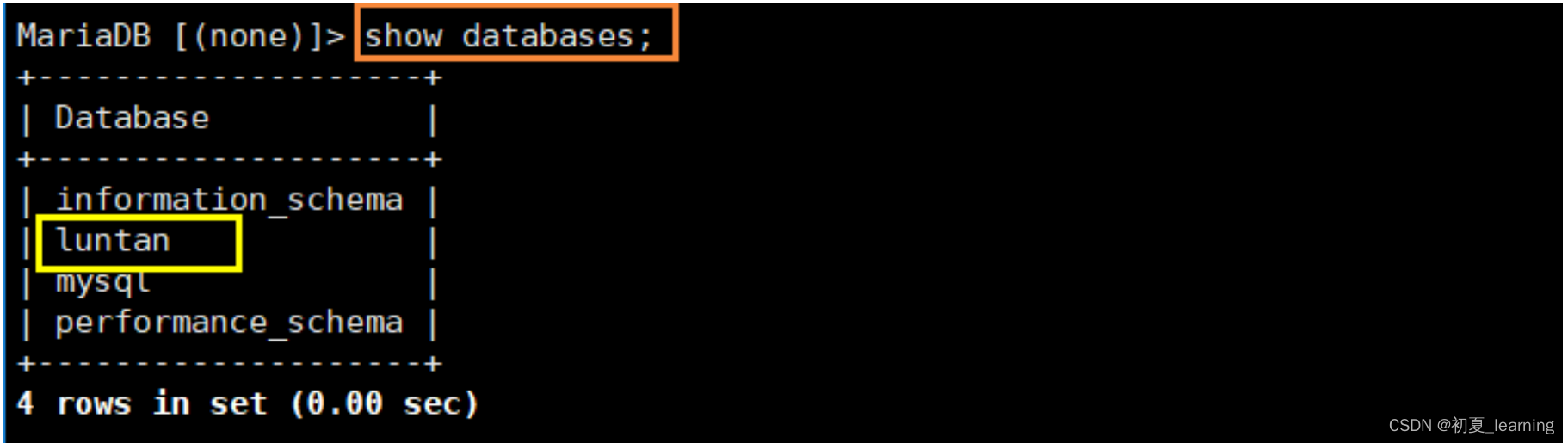 show databases;检查一下,发现luntan的数据库已经成功创建。