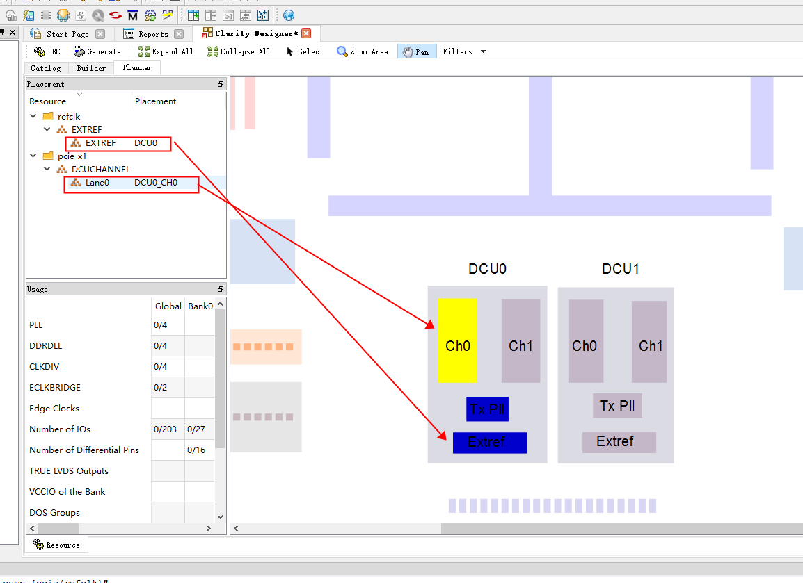 15.放大上图右下角DCU区域,放大方法:按住ctrl按键,滚动鼠标中键,拖拽extref到dcu的extref区域,拖拽Lane0到DCU的ch0区域。拖拽方法:鼠标按住左键不放,移动。