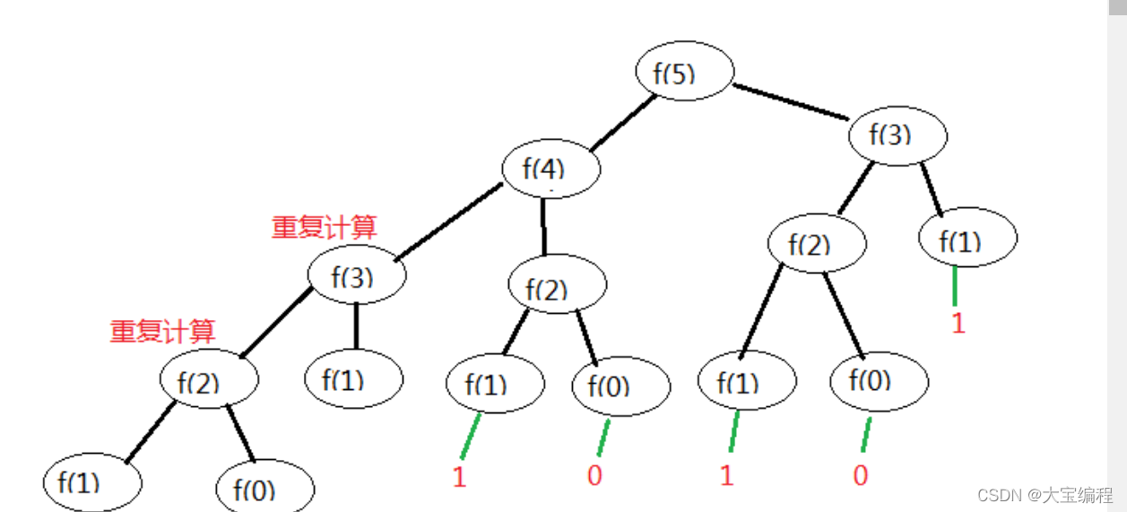 };这种解法的优点是思路清晰,代码简单,但是递归的调用,导致空间复杂度过于的即 递归中生成栈的空间。且存在很多次的重复计算: